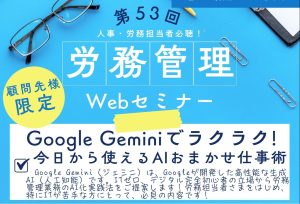 第53回の労務管理Webセミナーは「 Google Geminiでラクラク!今日から使えるAIおまかせ仕事術 」をお送…