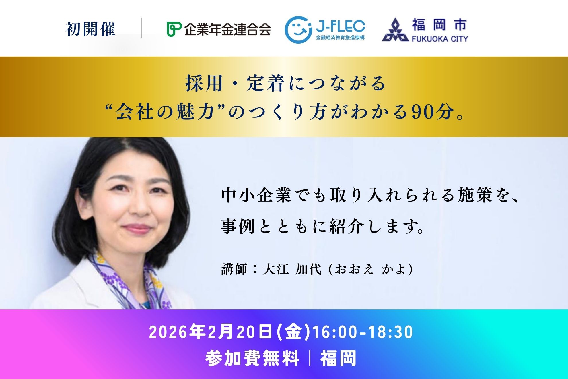 福岡開催「採用・定着につながる “会社の魅力” のつくり方がわかる90分セミナー」給与だけでは差別化が難しい時代。中小企業が「選ばれる会社」になるためには、社員が安心して働き続けられる環境づくりが欠かせません。そのなかで意外と見落とされがちなのが、“将来のお金の安心” をどう提供するかです。本セミナーでは、企業や官公庁で講演多数の専門家が、中小企業でも取り入れられる “会社の魅力づくり” の施…