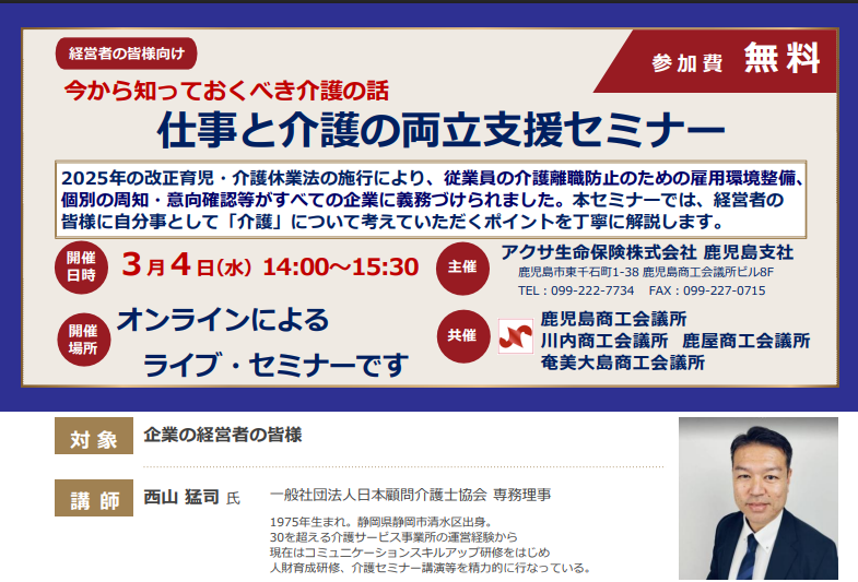今から知っておくべき介護の話 仕事と介護の両立支援セミナーのご案内です。 2025年4月から、男女とも仕事と育児・介護を両立できるように、育児期の柔軟な働き方を実現するための措置の拡充や介護離職防止のための雇用環境整備、個別周知・意向確認の義務化などの改正されました。今回のセミナーは、企業の経営者の皆様に自分事として「介護」について考えていただけるような内容になっているとのことです。※オンラインによるライブ・セミナー〇日時 2026年3月4日 14:00~15:30〇対象 企業の経営者の…