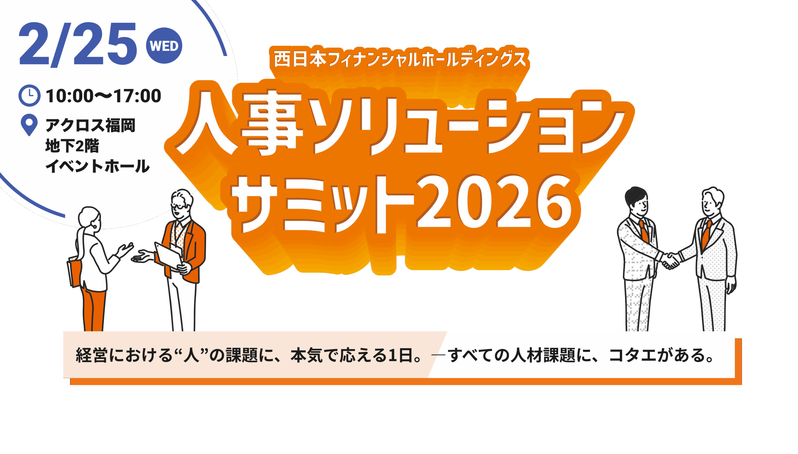 「Co-Creation for Innovative MIRAI 2030」<競争から共創へ:イノベーティブなミライ>みらいコンサルティンググループ様よりイベント開催のお知らせです。 「 人事ソリューションサミット2026 」とは、九州の中堅・中小企業の持続的な成長を支援するため、「 採用・定着・育成 」といった深刻な人事課題に焦点を当てた地域最大級のイベントです。 人的資本経営の第一人者による基調講演や、成長企業の経営者対談など、経営者様や人事担当者様にとって、情報収集の時間を一気に短縮…