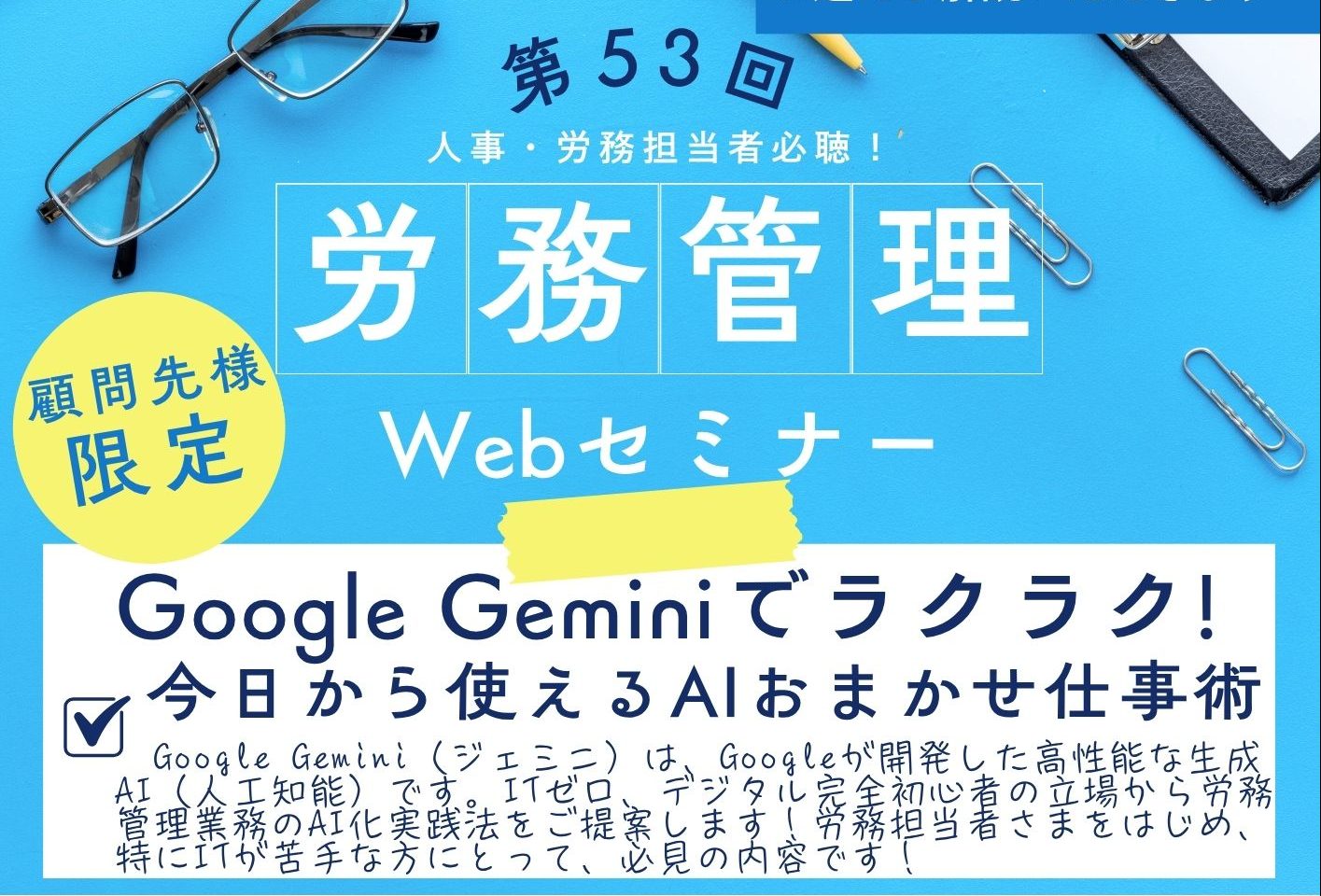 第53回の労務管理Webセミナーは「 Google Geminiでラクラク!今日から使えるAIおまかせ仕事術 」をお送りいたします! 今回は、講師に、株式会社MAREMI 代表取締役 吉岡 健太朗 氏をお迎えし、デジタル完全初心者の立場から、労務管理業務のAI化実践法をご提案します!労務担当者様をはじめ、特にITが苦手な方にとって、必見の内容です。