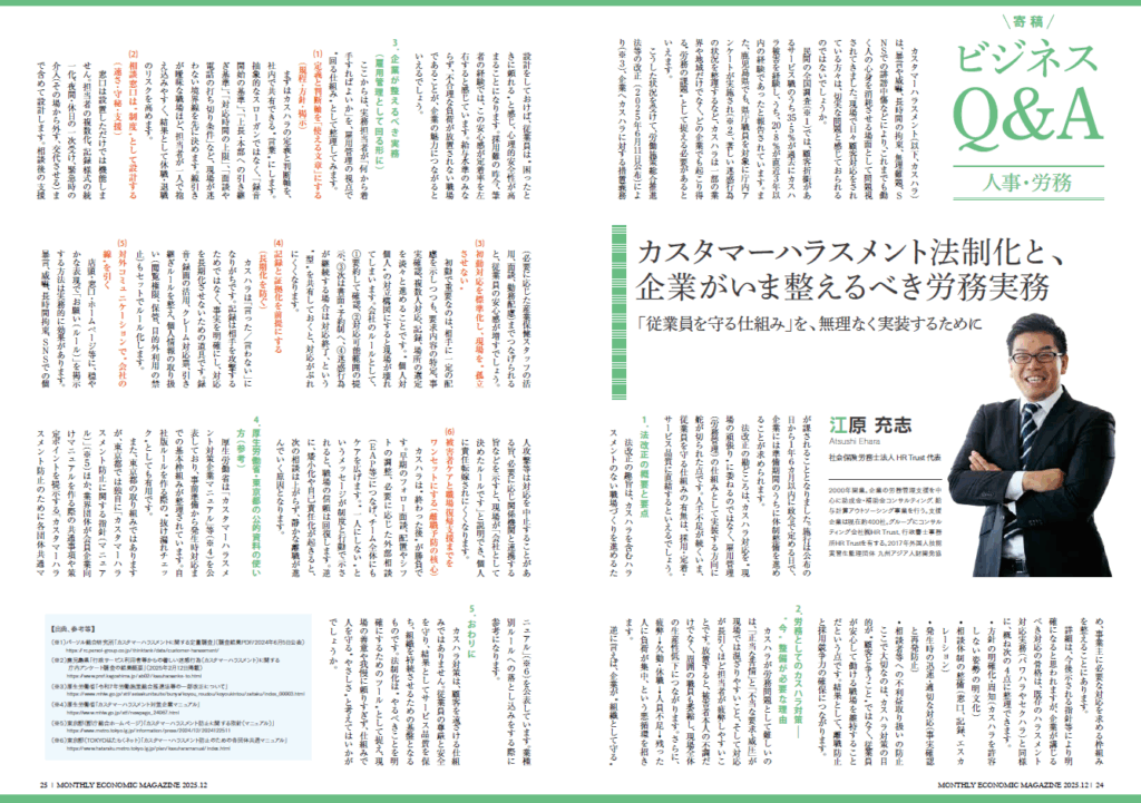 KER12月号 ビジネスQ&A【人事・労務】連載 KER12月号 ビジネスQ&A【人事・労務】連載記事が掲載されました。今回は、カスタマーハラスメント法制化と、企業がいま整えるべき労務実務 について寄稿いたしました。 タグ:労務,法改正,統計・情報 2026年01月02日